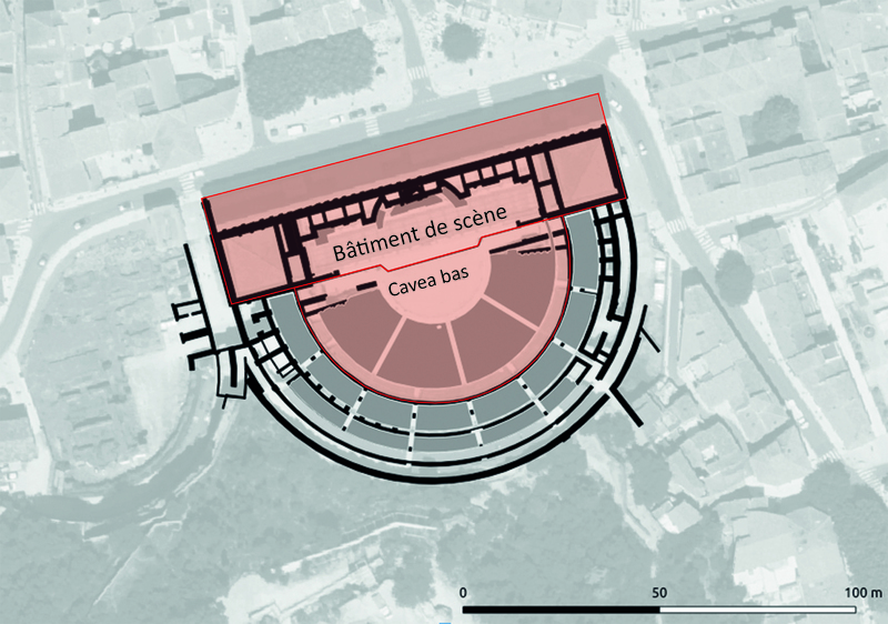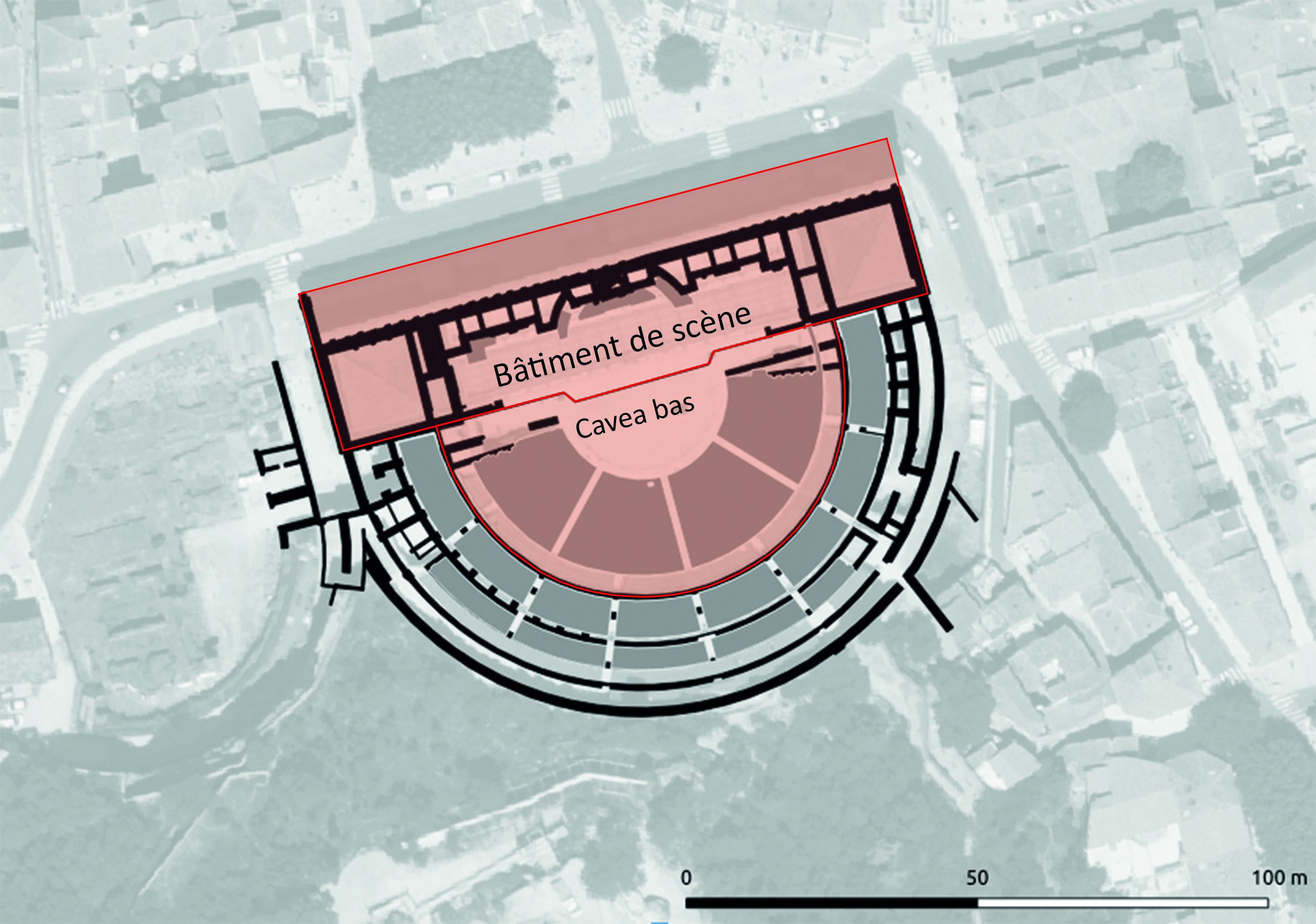 - Plan du secteur du bâtiment de scène avec le bas de la cavea