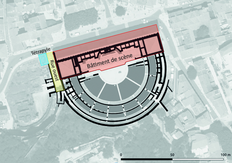 Théâtre antique d'Orange - Plan n°10 - Secteur du bâtiment de scène avec la rue ouest et le tétrapyle
