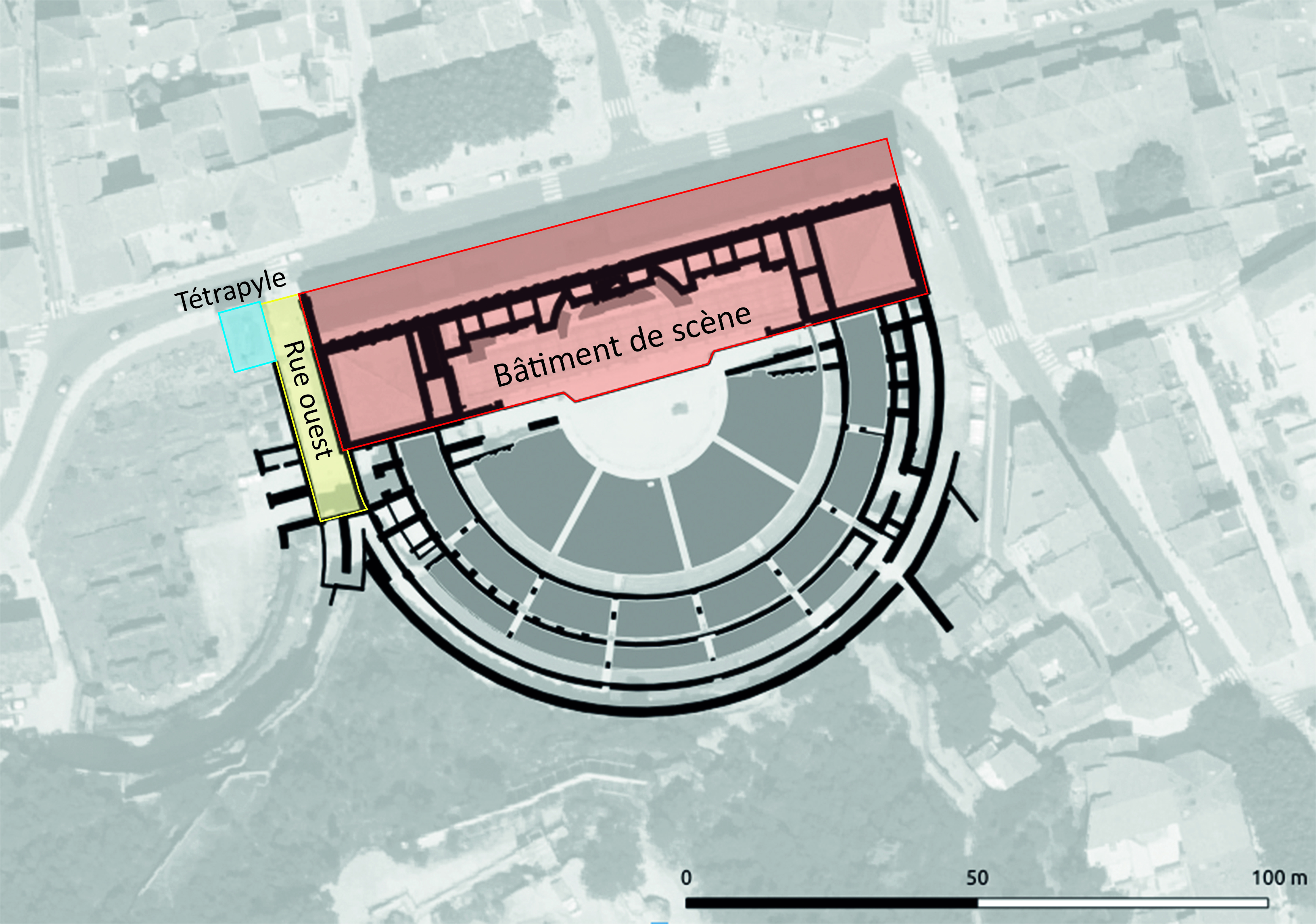 - Plan du secteur du bâtiment de scène avec la rue ouest et le tétrapyle