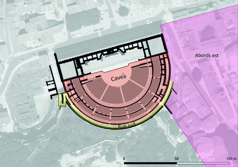 - Plan du secteur de la cavea avec la rue sud et les abords est