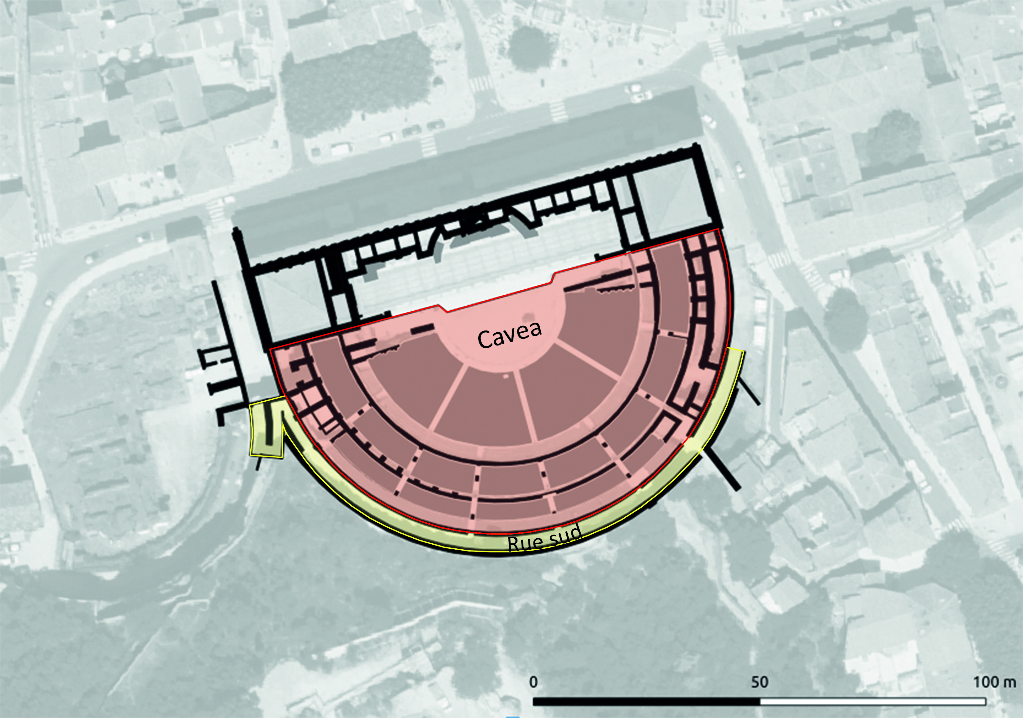 - Plan du secteur de la cavea avec la rue sud