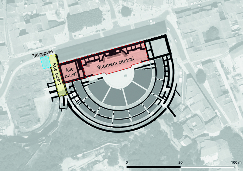 Théâtre antique d'Orange - Plan n°24 - Sous-secteur du bâtiment central avec l'aile et la rue ouest et le tétrapyle