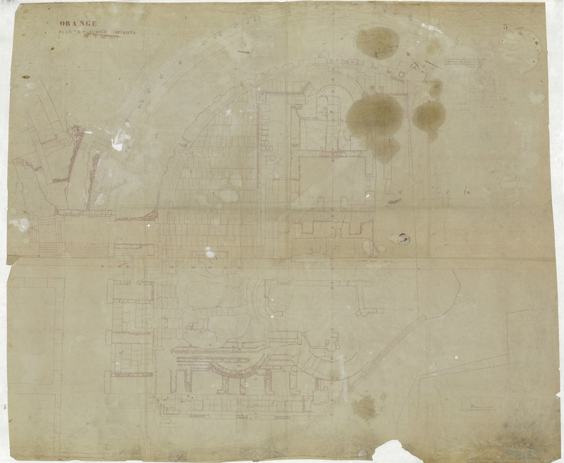- Tirage du plan du secteur du sanctuaire avec indication des altitudes (les mêmes que sur le plan IRAA_FR_OR_TE_GDFFO_0004), avec des annotations manuscrites et un croquis d'une élévation. Document signé F. A pour François Anus ? Etat très dégradé.