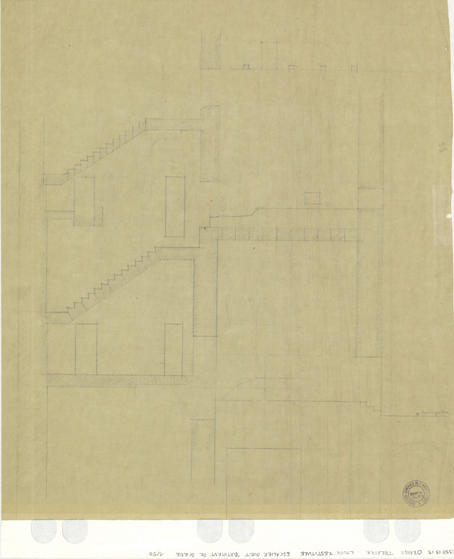- Coupe nord-sud de l'escalier ouest du bâtiment de scène au 1/50 (?). Minute (inachevée) au crayon sur calque.