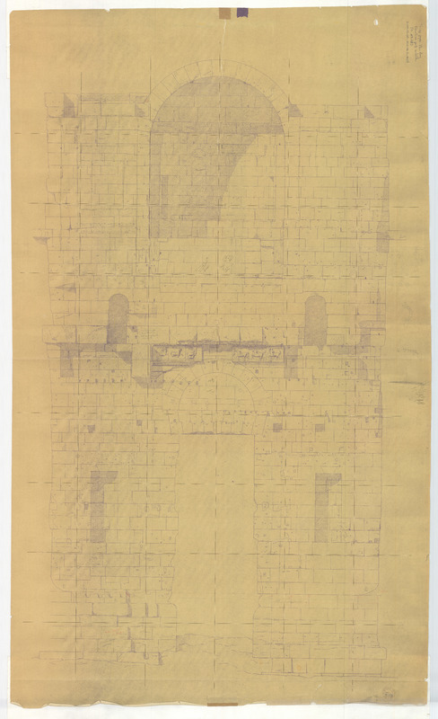 - Tirage à l'encre bleue du relevé pierre à pierre de l'élévation de la partie centrale du mur de scène (porte royale et niche centrale). Annotations manuscrites au crayon.