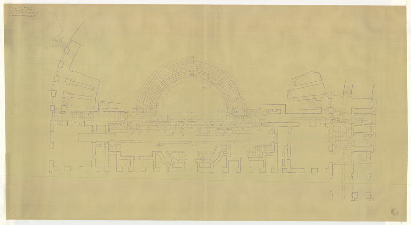 - Tirage à l'encre bleue du plan du théâtre au niveau des premiers gradins de l'ima cavea (niveau 1). Relevé pierre à pierre partiel : du dallage des aditus, de la rue ouest et du portique latéral, des premiers gradins et de l'hyposcaenium. Le réseau d'égout est représenté en trait-point.