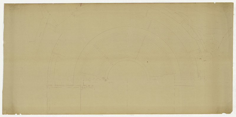 - Vue en plan partielle du théâtre et de ses abords avant la reconstruction des escaliers est et ouest, avec cotes altimétriques