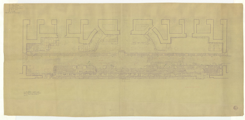 Tirage du plan du bâtiment central et du relevé pierre à pierre de l'hyposcaenium avec restitution de l'emplacement des colonnes au crayon et diverses annotations manuscrites ("les chiffres en vert se rapportent au devis établi en février 1952 et indiquent les points où il est nécessaire de faire des reprises en maçonnerie", et "cotes rouges d'après un document de M. Formigé")
