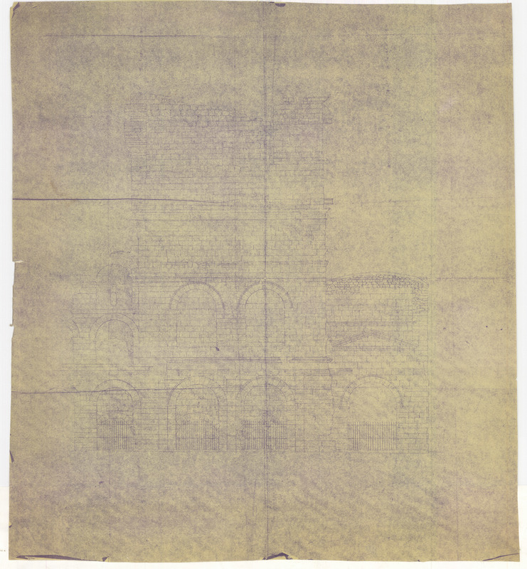 Tirage à l'encre bleue de l'élévation est du théâtre (façade est du bâtiment de scène avec le début des arcades de la cavea, et en arrière plan la façade est du tétrapyle et la façade est du portique latéral du secteur du forum). Relevé pierre à pierre de l'état avant restauration