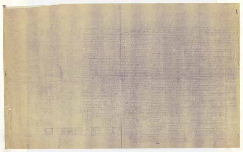 - Tirage à l'encre bleue de l'élévation sud de la moitié occidentale du bâtiment de scène et du tétrapyle (façade sud de la basilique ouest, moitié occidentale du mur de scène et façade sud du tétrapyle). Relevé pierre à pierre de l'état avant restauration. Suite du document IRAA_FR_OR_TA_GDFFO_0028