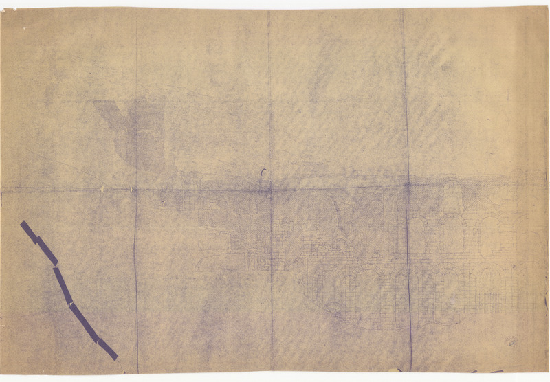 - Tirage à l'encre bleue du relevé en coupe de l'élévation est de la cavea. Relevé pierre à pierre de l'état avant restauration.