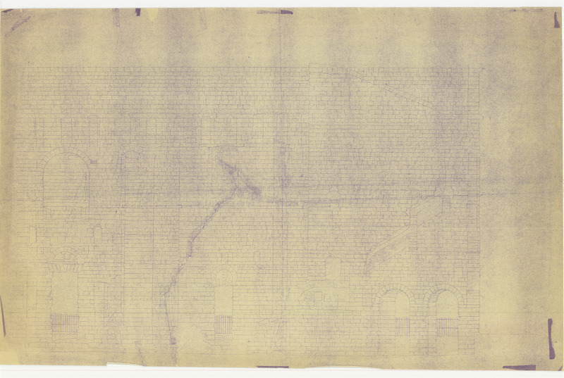 - Tirage à l'encre bleue de l'élévation sud de la moitié orientale du bâtiment de scène (moitié est du mur de scène et façade sud de la basilique est). Relevé pierre à pierre de l'état avant restauration. Suite du document RAA_FR_OR_TA_GDFFO_0026