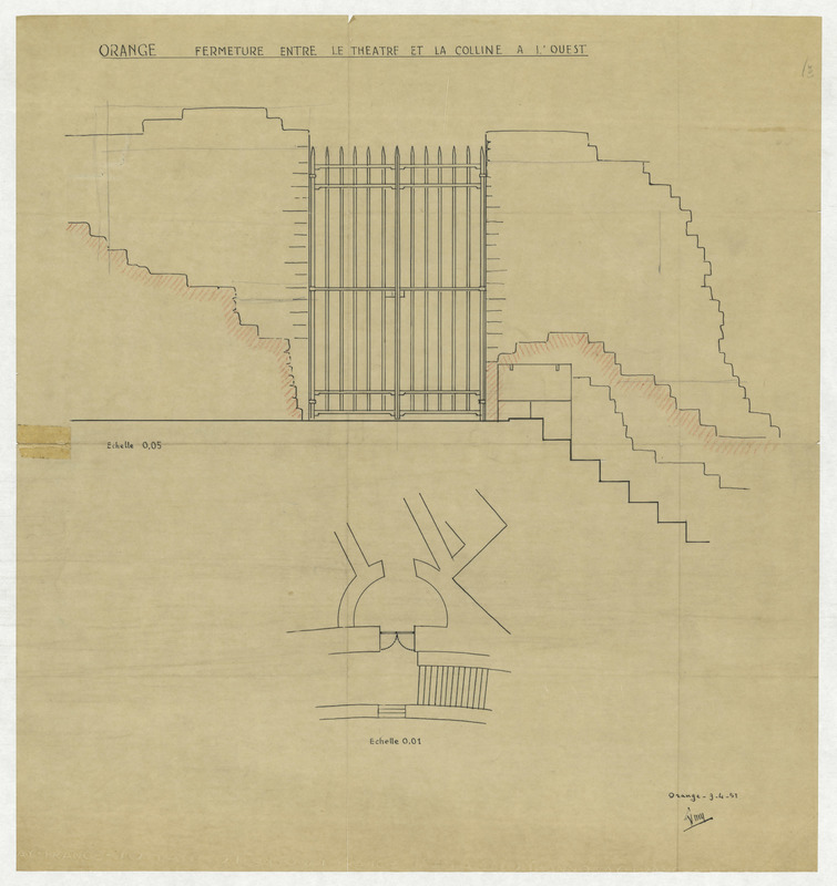 - Elévation de part et d'autre de la baie ouest de la rue sud au 0,05 avec délimitations des différents types de maçonneries et plan au 0,01Daté et signé : Orange - 9 - 4 - 51, Amy. Mise au net de IRAA_FR_OR_TA_GDFFO_0034