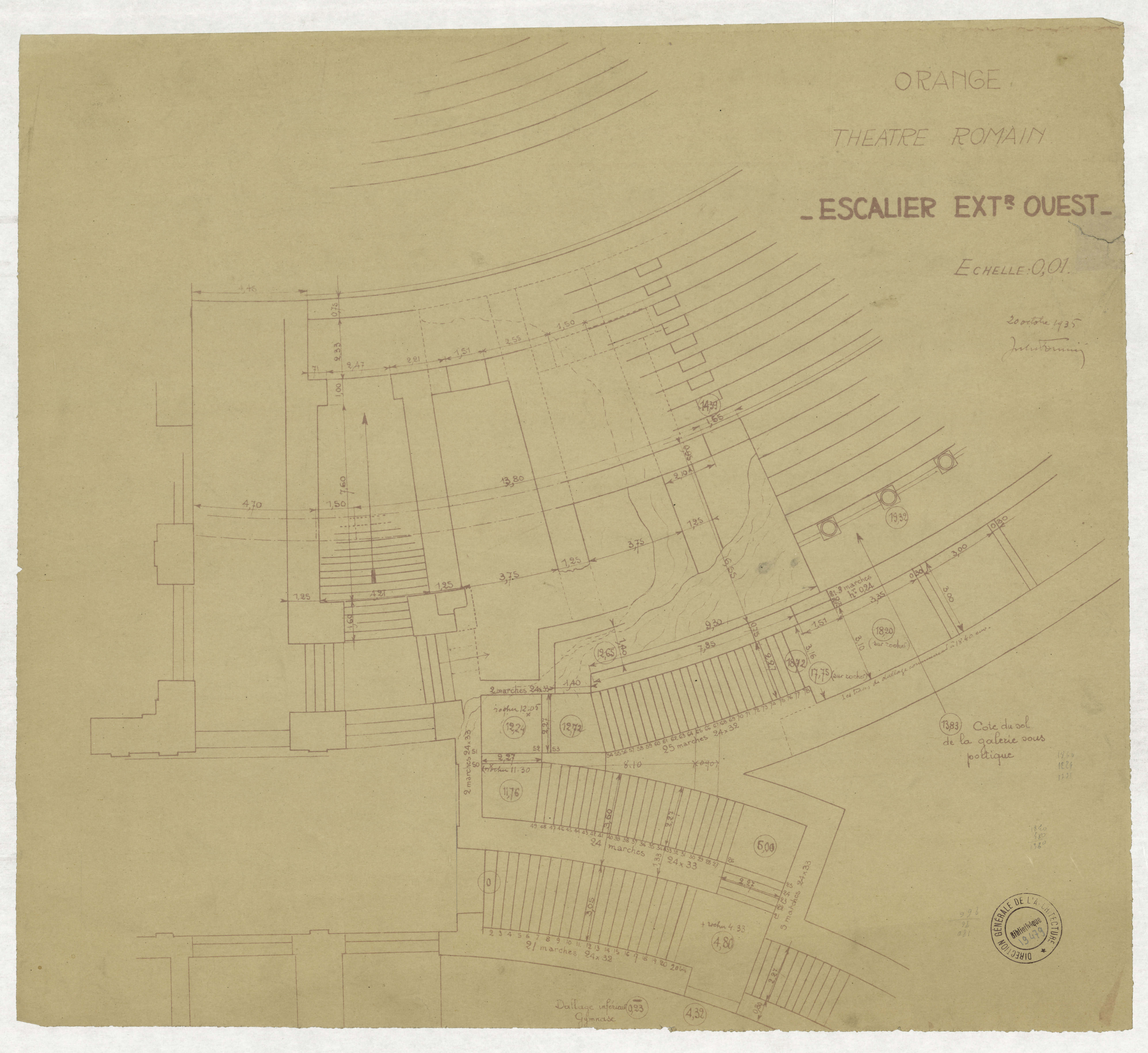 - Tirage à l'encre rouge du plan du projet de construction de l'escalier ouest au 0,01. Plan avec cotes et altitudes, daté et signé ("20 octobre 1935 Jules Formigé").
