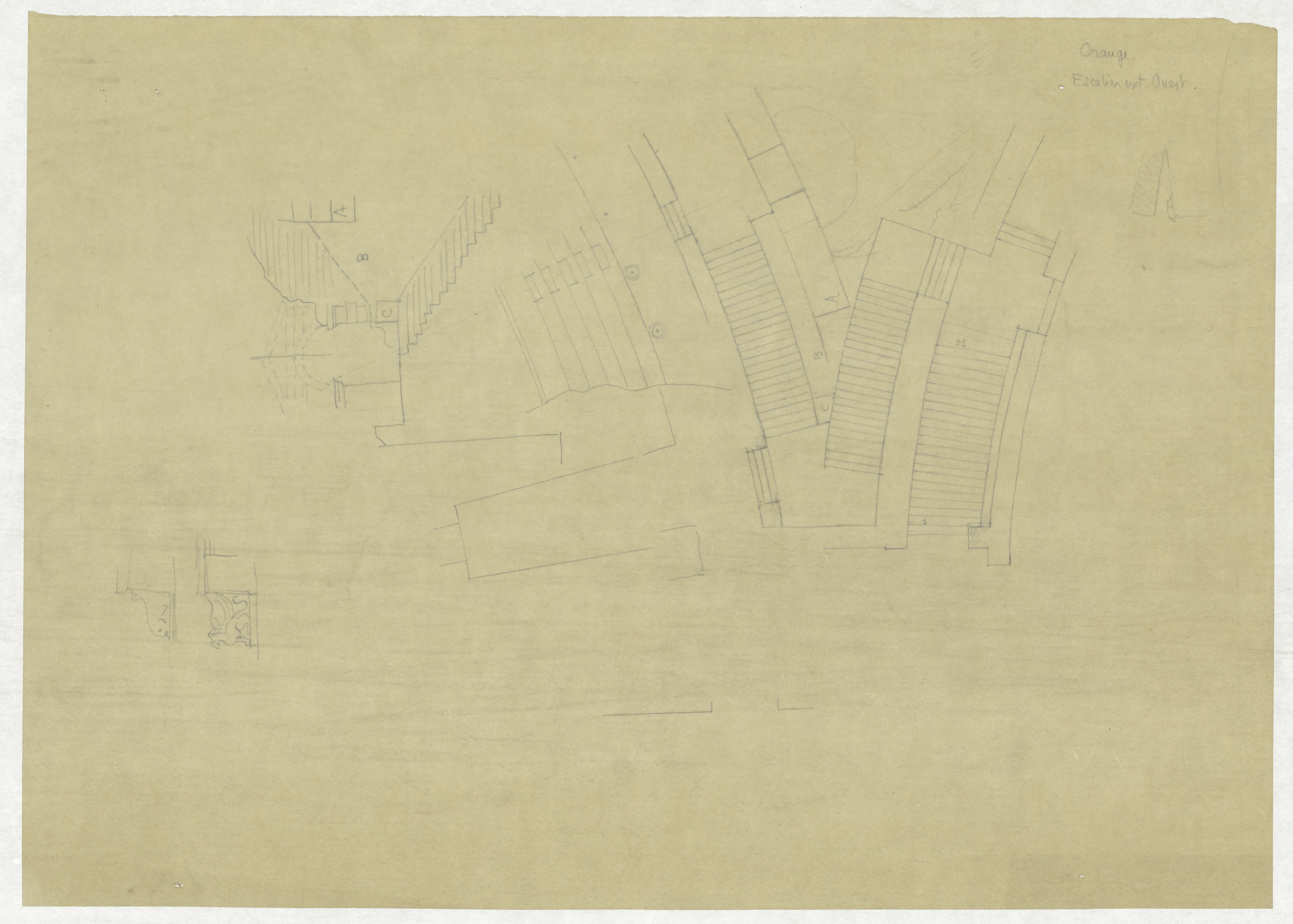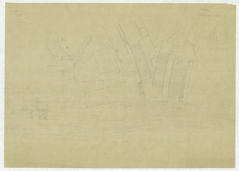 - Plan au crayon de l'escalier ouest avec localisation de la coupe dessinée à côté. Projet de construction de l'escalier ouest