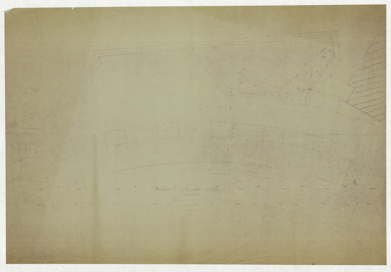 - Tirage à l'encre rouge du plan du projet de construction de l'escalier est à l'échelle 0,02. Plan avec cotes et altitudes. Signé, mais signature illisible. Suite des plans IRAA_FR_OR_TA_GDFFO_0037 et IRAA_FR_OR_TA_GDFFO_0038