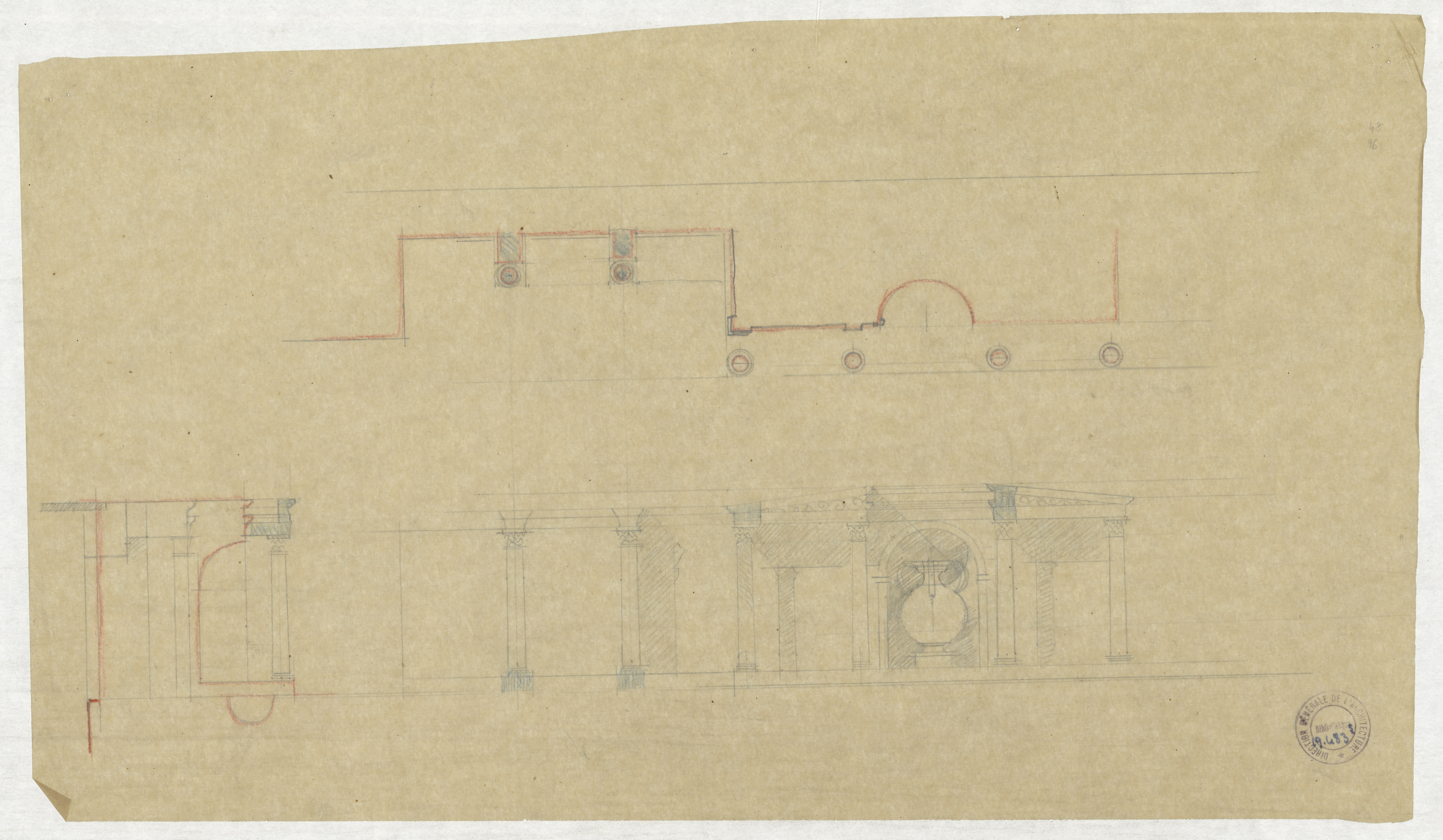 Orange - Théâtre antique - Détail de la restitution en plan, en coupe et en élévation du front du pulpitum