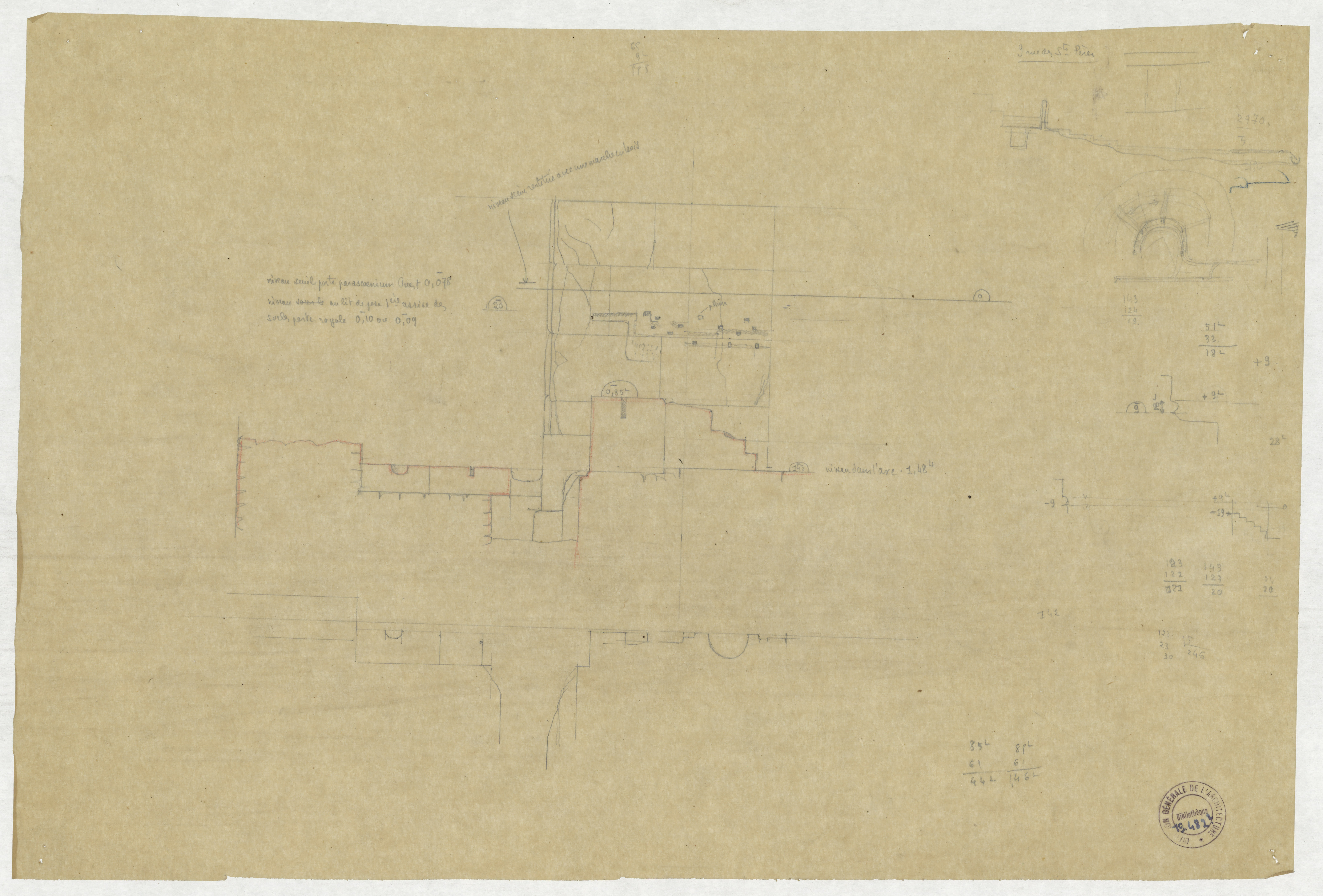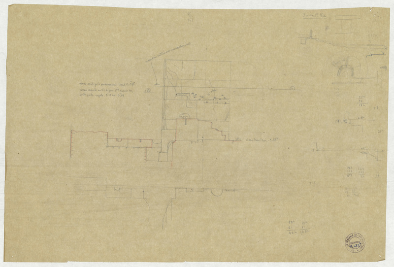 - Relevé en coupe de la fosse du rideau de scène avec en arrière plan le pierre à pierre du retour du parodos est. Coupe avec cotes et annotations. Quelques croquis et annotations dans la marge droite.