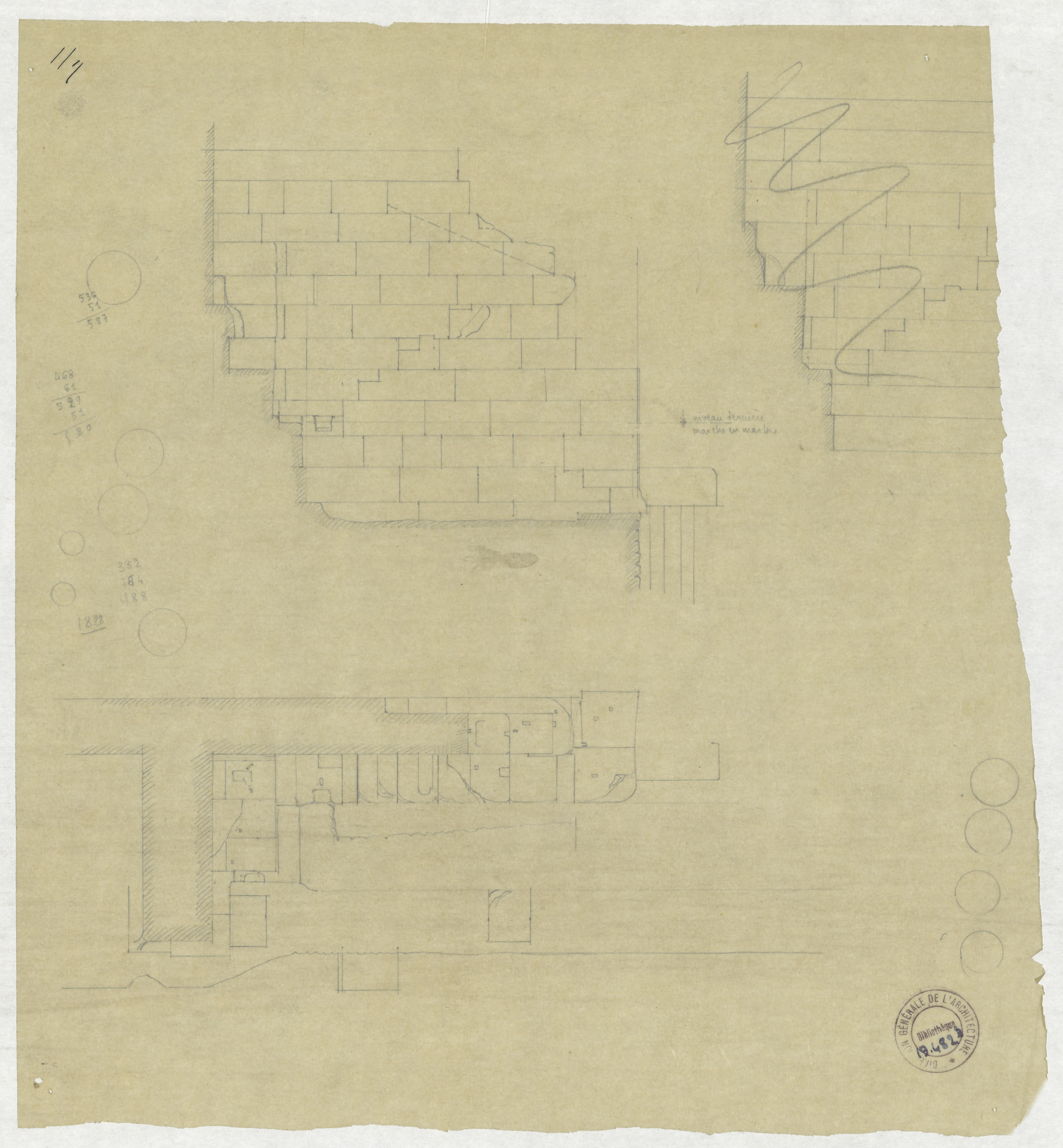 Relevé pierre à pierre de l'élévation côté scène du parodos est. Relevé pierre à pierre en plan du secteur sud-est de l'hyposcaenium (entre le parodos est et le retour latéral est du mur de scène)