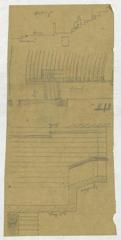 Deux croquis qui représentent la coupe et le plan restitués de l'aditus est. Un troisème croquis est dessiné à l'envers par rapport au deux autres et représente en coupe les premières rangées des gradins (proédrie).