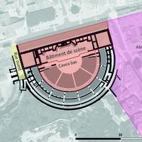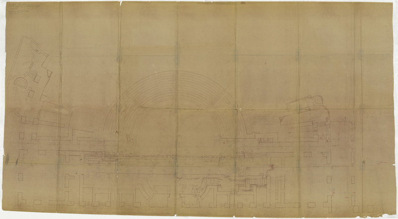 Tirage du plan du théâtre au niveau des premiers gradins (niveau 1). Dessin du relevé pierre à pierre de l'hyposcaenium. Nombreuse annotations manuscrites. Echelle 1/100 (?).