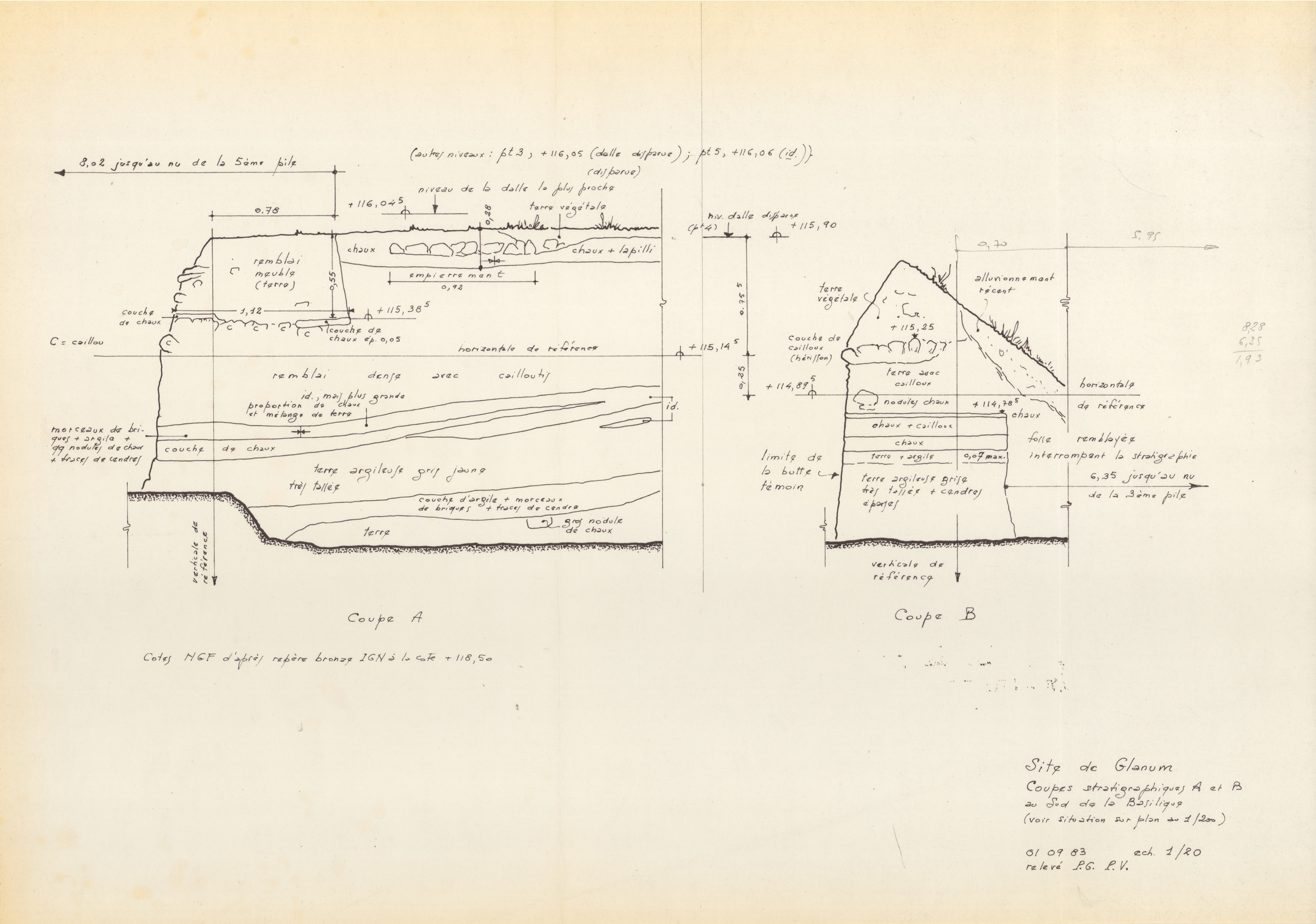 - "Coupes stratigraphiques A et B au Sud de la basilique (voir situation sur plan au 1/200e)" - Relevé P.G. P.V. 1/20 et date du 01 09 1983