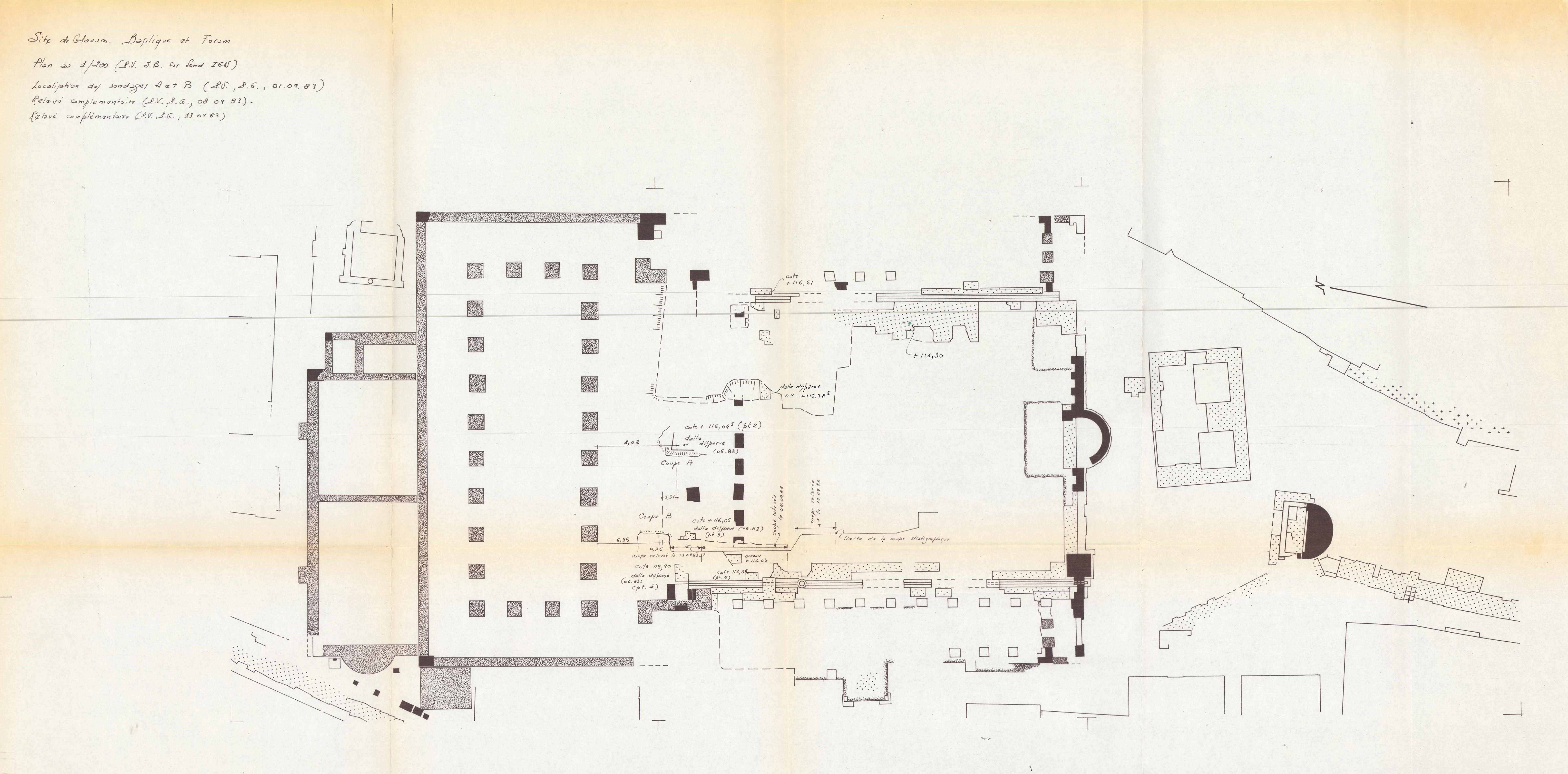 - Basilique et forum - Plan au 1/200 (P.V. J.B. sur fond IGN) - Localisation des sondages A et B (P.V., P.G., 01 09 1983) - avec la liste des relevés complémentaires des 8 et 13 septembre 1983 - Annotations